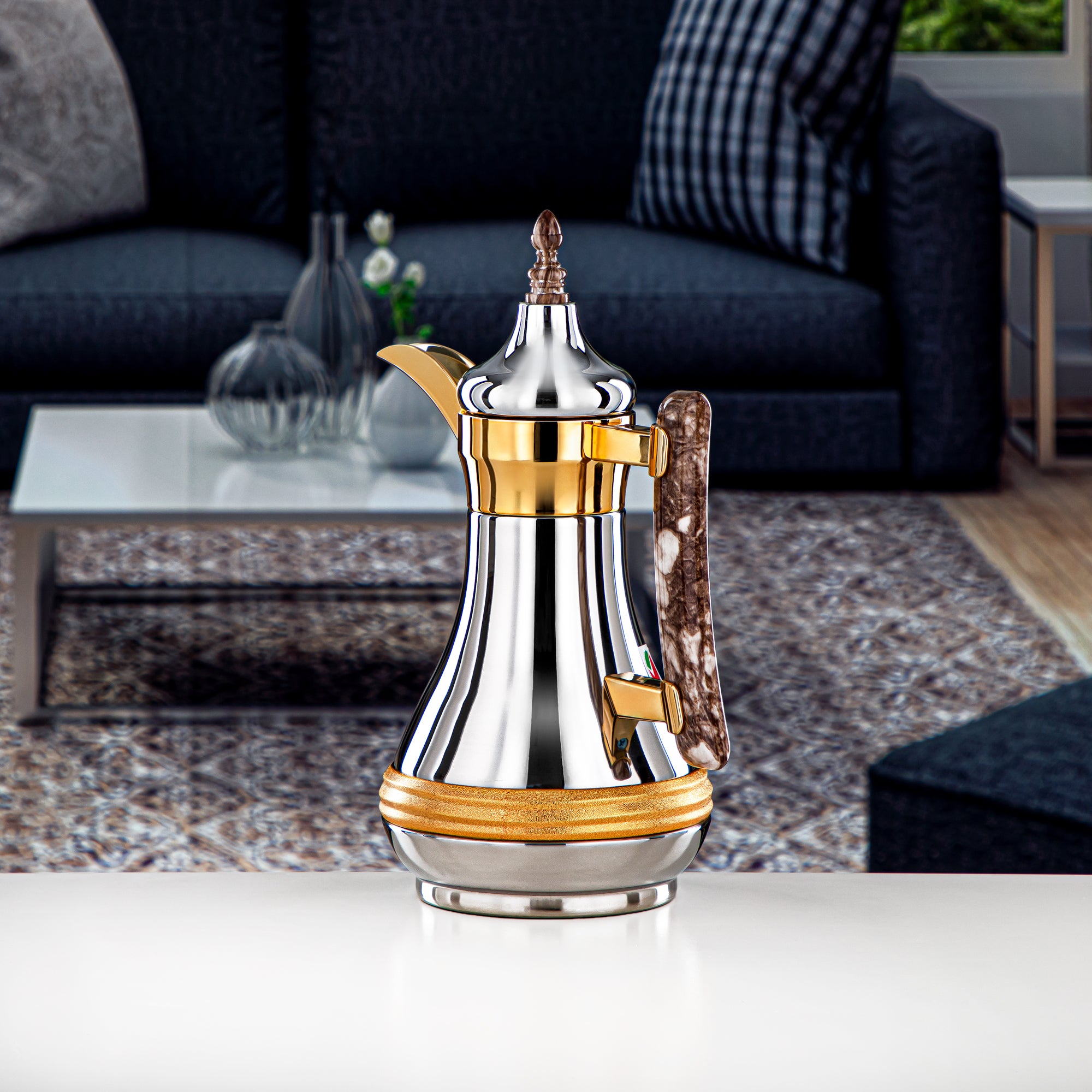 Indulge in the luxury of Almarjan's 0.6 Liter Stainless Steel Vacuum Dallah. With double wall stainless steel construction and a sleek silver & golden design, this dallah is both aesthetically pleasing and functional. The striking brown marble handle and knob add a touch of elegance, while the push button makes it perfect for serving traditional Arabic coffee during special occasions like Ramadan and Eid.